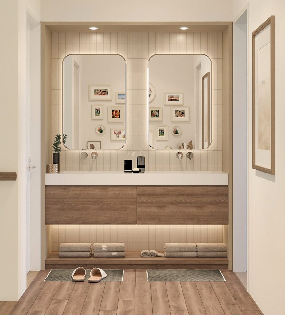 Với nội thất cho phòng vệ sinh nhà nhỏ ưu tiên những gam màu tươi sáng như màu trắng và be, nâu nhạt. Để tối ưu diện tích nên tận dụng những hộc tường để tạo thành ngăn đựng đồ dùng.