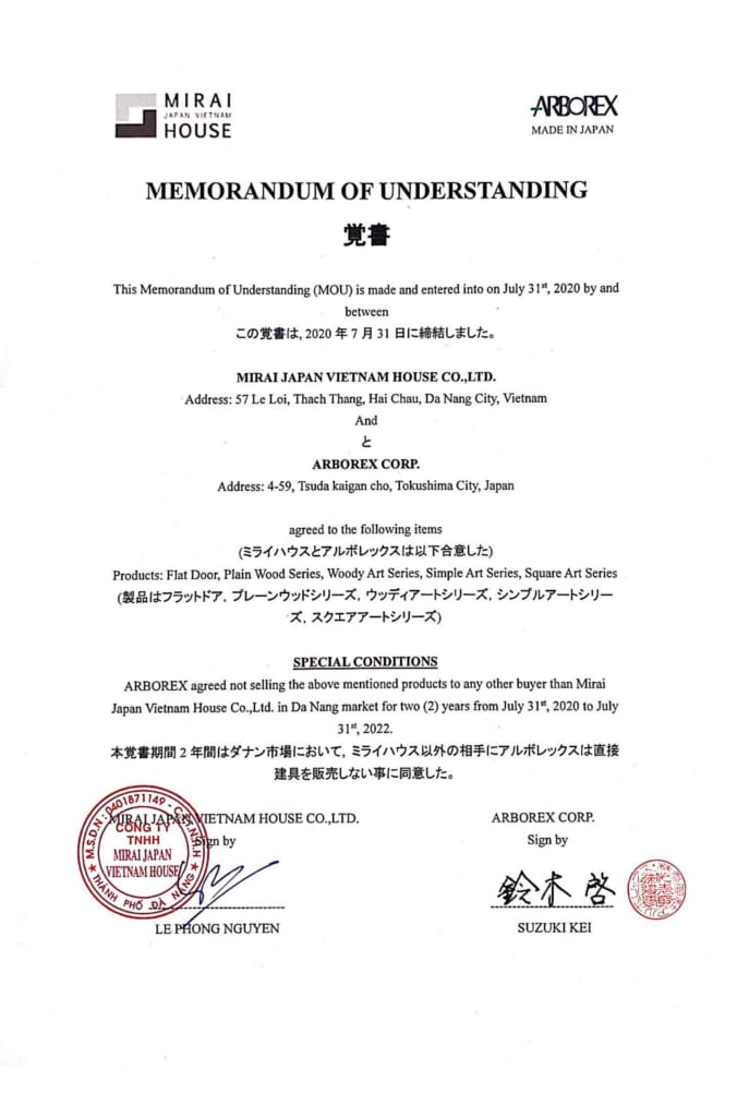 Bản ghi nhớ hợp tác kinh doanh giữa Công ty cửa gỗ Arborex Nhật Bản và Công ty TNHH Mirai Japan Vietnam House