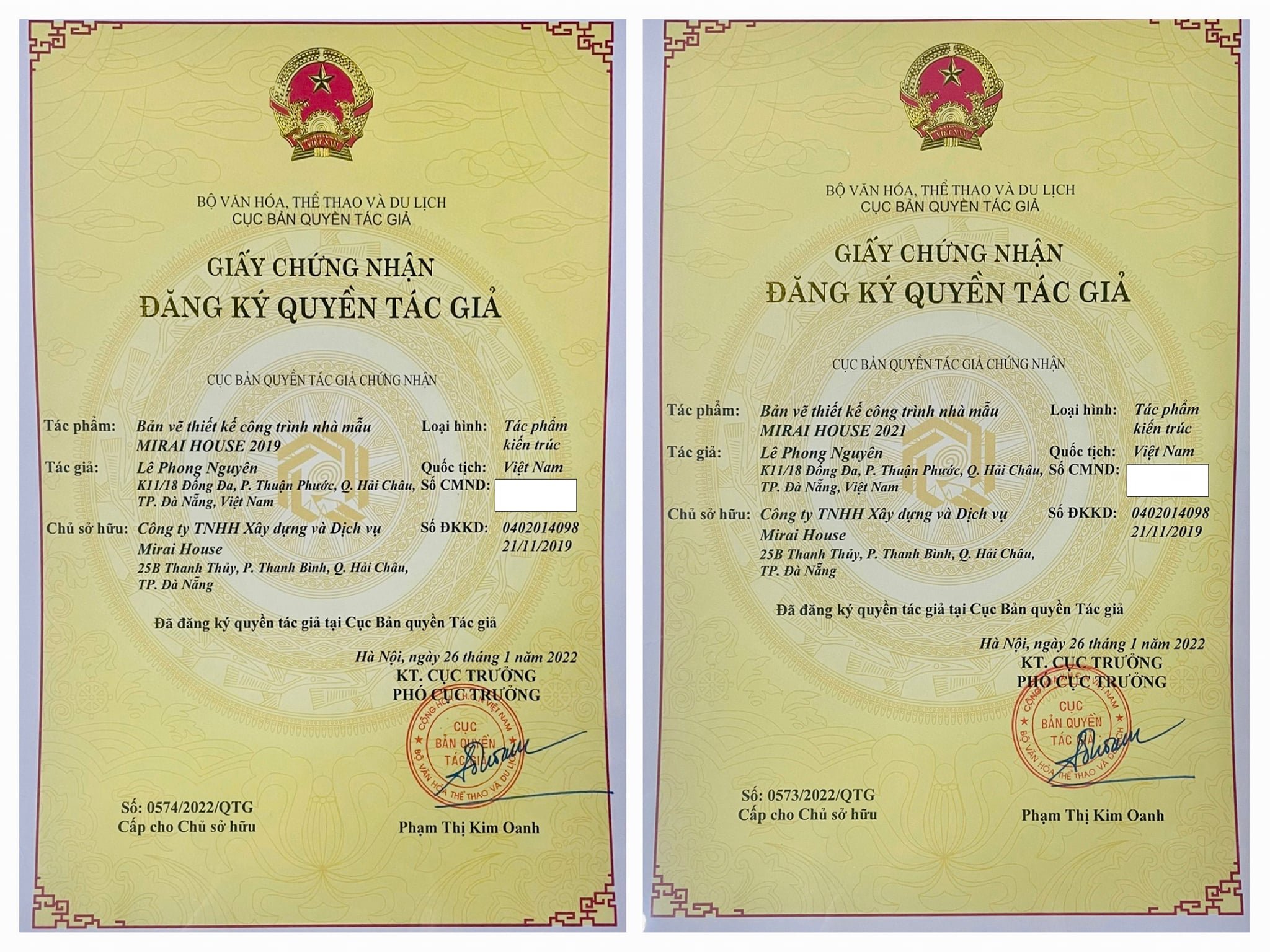 Tất cả các sản phẩm thiết kế của Mirai House đều đã được đăng ký quyền sở hữu trí tuệ tại Cục Bản Quyền Tác Giả thuộc Bộ Văn Hóa Thể Thao và Du Lịch Cục Bản Quyền Tác Giả bao gồm các hạng mục thiết kế ngoại thất, nội thất liên quan đến công trình. Các thiết kế được trực tiếp sáng tạo bằng lao động trí tuệ mà không sao chép từ tác phẩm của người khác.