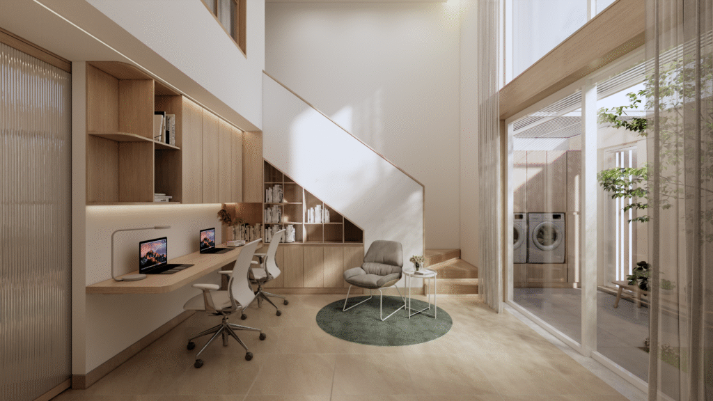Không gian nội thất mang tinh thần tối giản ấm cúng, với bảng màu dịu nhẹ và chất liệu gỗ tự nhiên làm chủ đạo. Các mảng xanh được sắp đặt khéo léo trong từng góc nhỏ, tạo cảm giác thư thái và cân bằng. Phòng ngủ và khu vệ sinh được bố trí tách biệt, giữ sự riêng tư mà vẫn hài hòa với tổng thể chung. Trên tầng ba, khu vực làm việc yên tĩnh với bàn đôi cạnh cửa sổ lớn giúp tận dụng tối đa ánh sáng ban ngày.